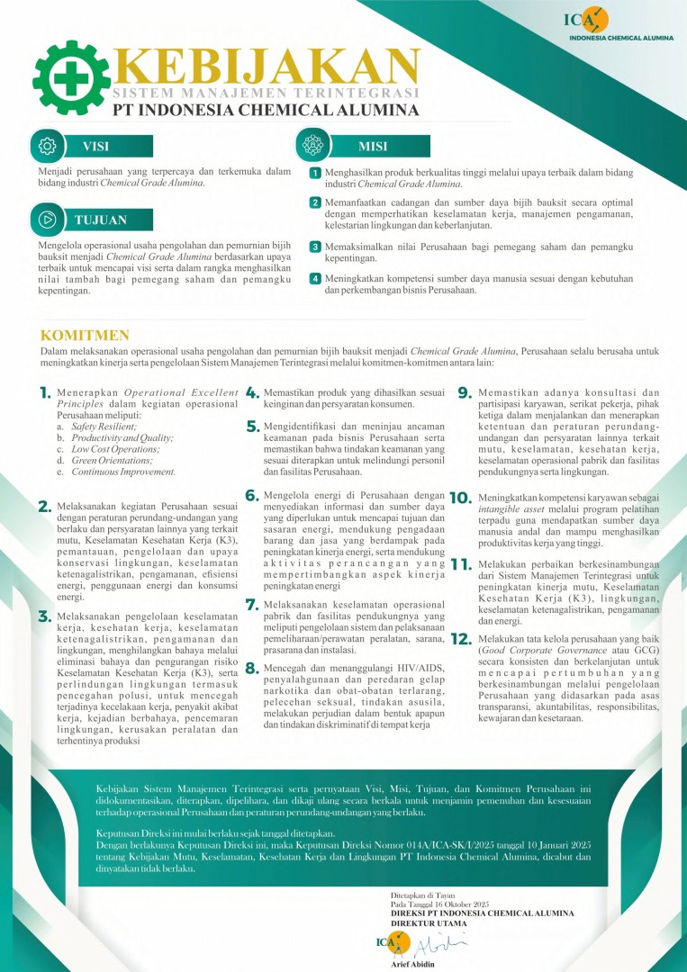 ICA believes that the Company’s implementation of GCG strongly supports the achievement of the Company’s vision to be become a trusted, prestigious, and internationally reputable company in the alumina industry. Through the implementation of GCG practices, ICA conducts its business activities in accordance with regulations, norms and best practices. The Company strives to meet stakeholder expectations and provides maximum benefit through improved performance, comprehensive risk management and implementation of corporate social responsibility. ICA’s commitment to implement GCG in every business activity is reflected most clearly in two courses of action. First, consistent compliance with all legislation and regulations. Second, a proactive approach in the implementation of code of conduct to improve the integrity of all employees.